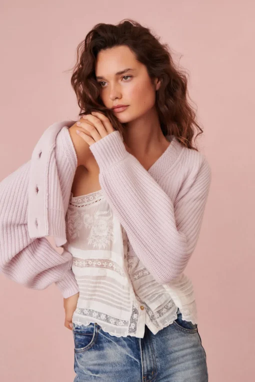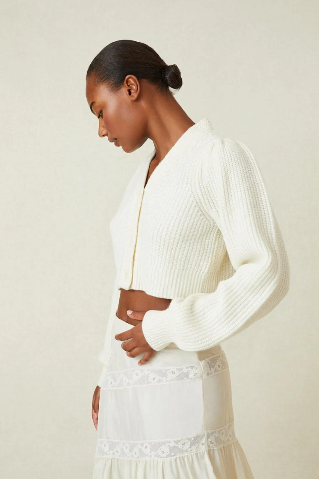 A signature favorite, our Avignon Cardigan is back in a cashmere-wool blend with intricate knit techniques. This cropped sweater, at once cozy and cute, has a v-neck that descends to three buttons at center front. Pleated blouson sleeves extend to ribbed cuffs at opening. </div