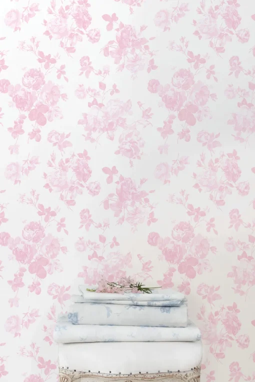 This romantic, vintage-inspired floral design adds timeless elegance and femininity to your home. Bouquets of voluptuous roses and leafy accents are inked in shades of light blue against creamy white. Each roll measures 20.5” x 33′.