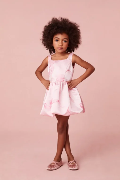 Our girls are pretty in pink in this gorgeous must-have dress. With our custom LoveShackFancy bow jacquard taffeta fabric, this dress is ready to make magic moments. She begins with tank top straps and a fitted top before falling to a sweet, bubble-like skirt.