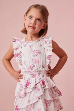 The Decker Dress for girls returns in 100% cotton with custom lace and a dainty floral print. This easy frock has a ruffle-trimmed collar, buttons down center front, flutter sleeves, an elastic waist and overlapping asymmetrical ruffles at the skirt.