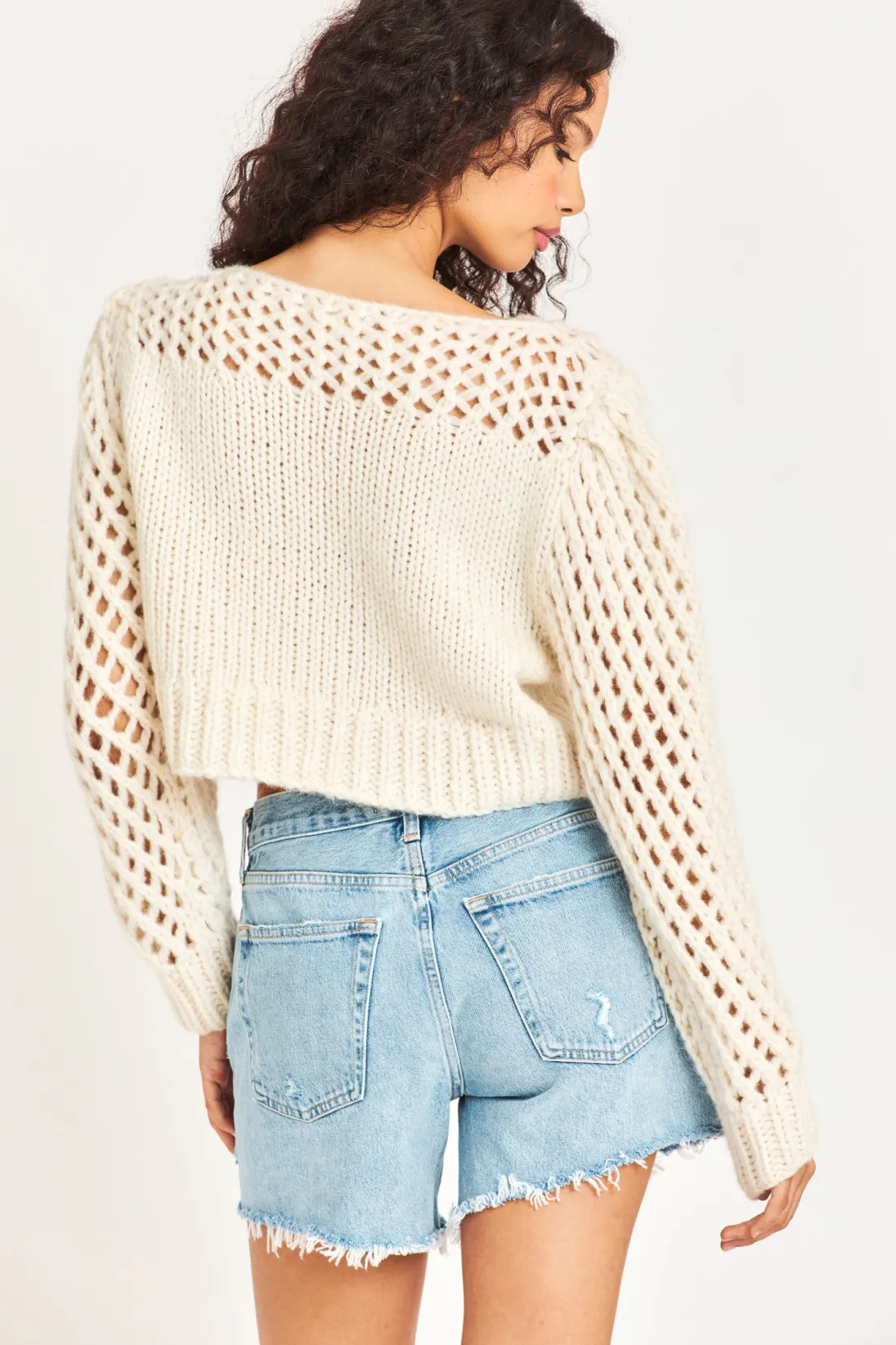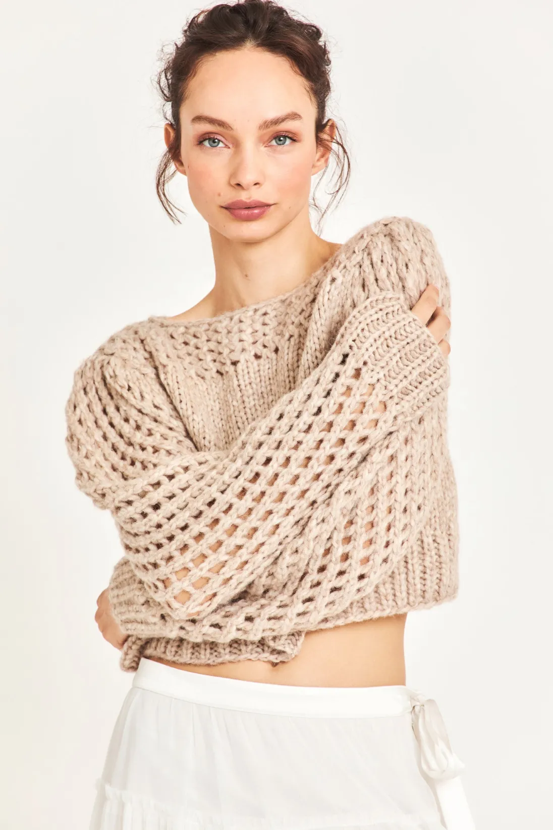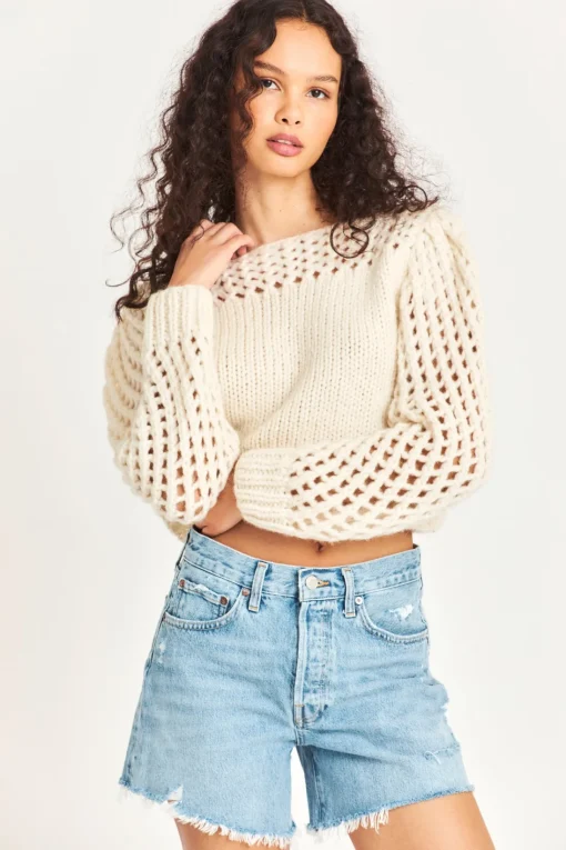 Love layers with our Larson Crop Pullover. This ultra-soft sweater is delicately hand-knit from a Peruvian alpaca blend into a stunning, semi-sheer, clip dot fabric. With a silky and luxurious feel, this must-have top features gorgeous pointelle sleeves and pointelle detailing underneath the boat neckline. The top slightly crops at the hem for a playful finish. </div