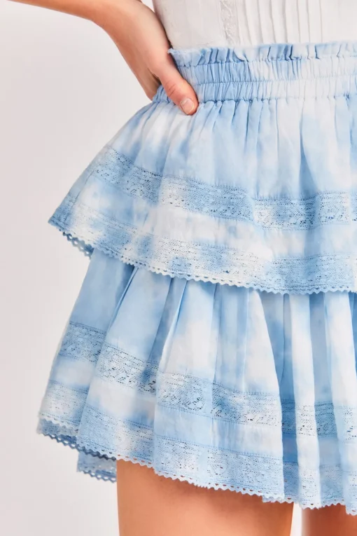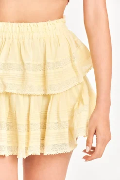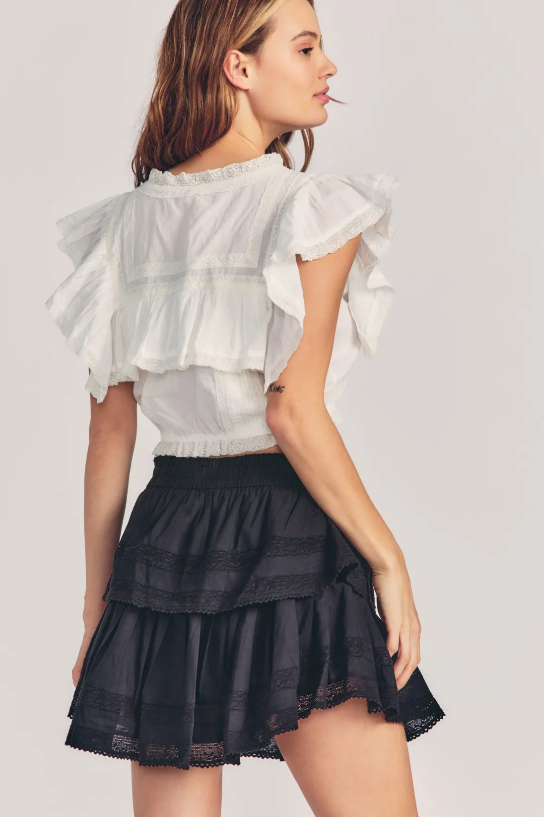 Our best selling Ruffle Mini Skirt returns for the season. She features intricate inset lace trims and allover pintuck details. The elasticated waistband and double lining offers flexibility in comfort and styling. Tiered ruffles exude effortless femininity. The mini is finished with a frayed, raw hem for added playfulness.