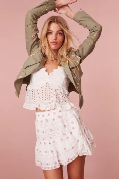 Obsessed with the Agnessa Skirt. This pretty mini is lightweight and airy with a soft, cotton striped dobby fabric embroidered with small pink roses all over. She begins with an elasticated waistband that falls to a sweepy playful mini skirt with asymmetrical ruffles and lovely lace stripped throughout.