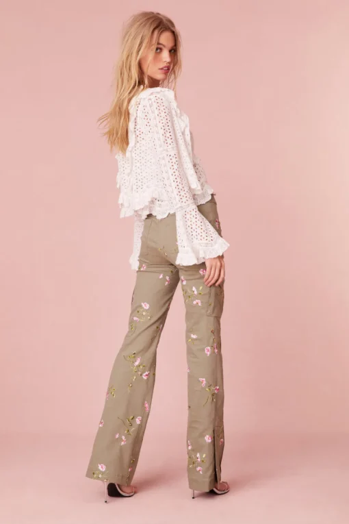 Step into spring with the Atworth Pant. Designed from a stretch twill fabric, these military-inspired cargo pants get the LoveShackFancy touch with pink florals embroidered all over. With a slim fit and full length, these pants have a slit detail on the sides and cargo pockets.
