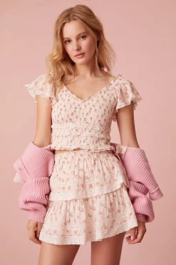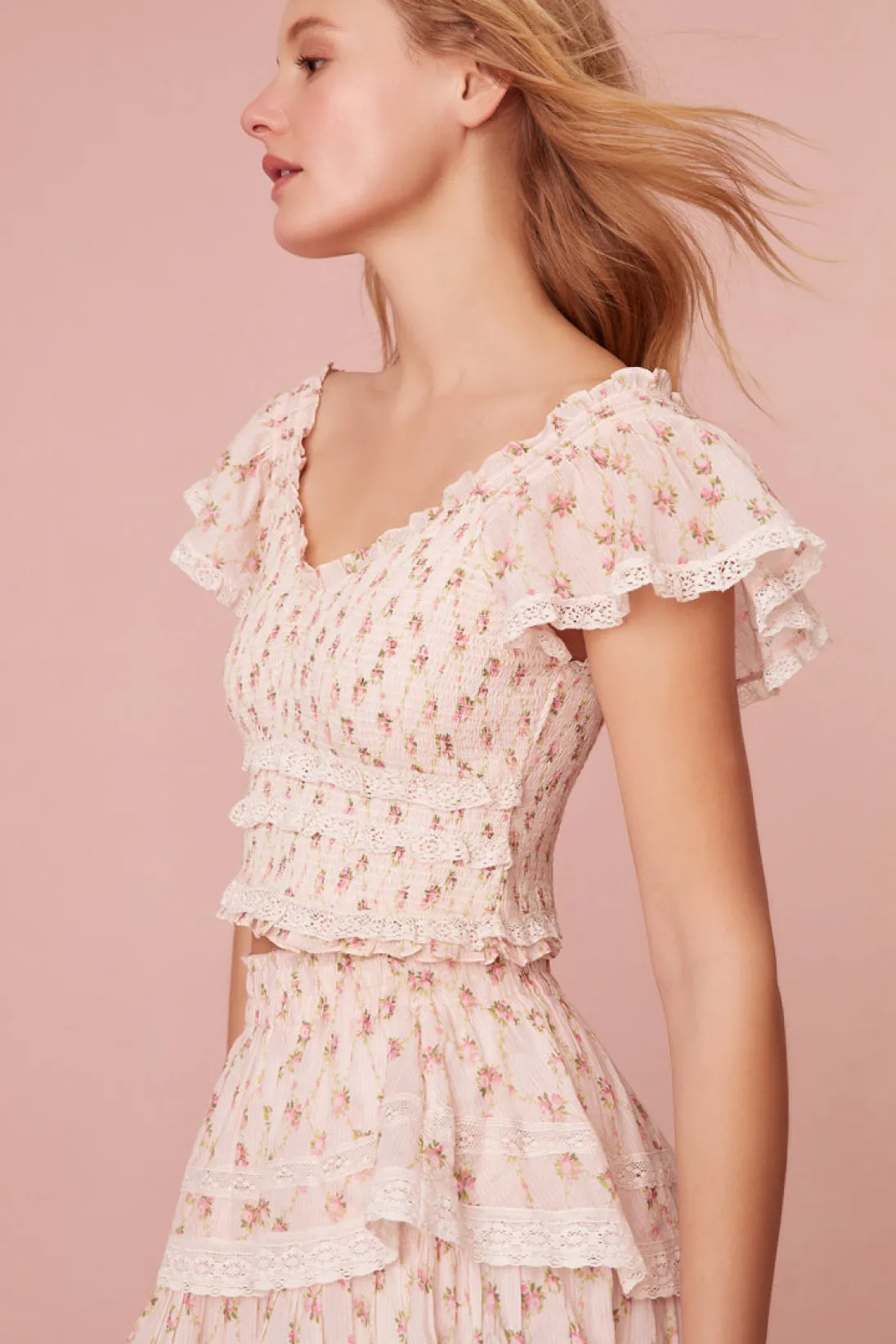 Forever sweet in the Beaming Top. This pretty top stuns with a dainty floral printed cotton voile fabric. Slightly cropped, the top features short puff sleeves with lace trimming, a sweetheart neckline, and a smocked bodice. Pair with the Ruffle Mini Dainty Floral Cotton Skirt for a full look.</div