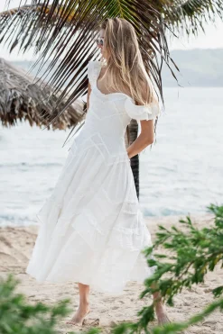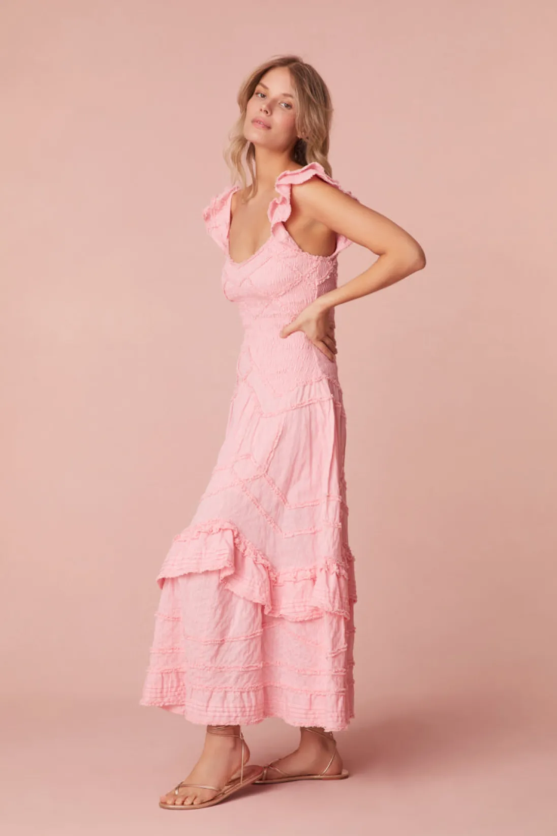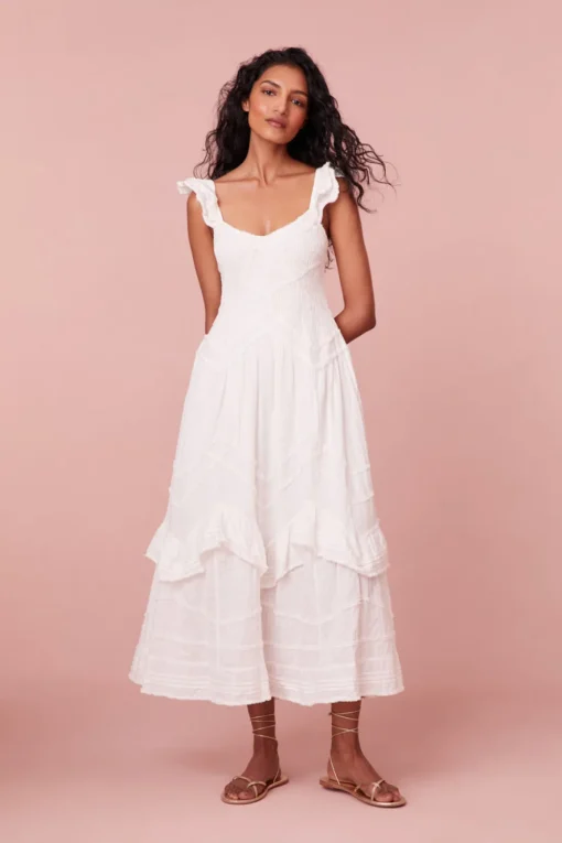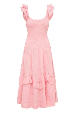 Step into sunshine with the Brin Dress. Designed from a springtime cotton dobby striped fabric, with a subtle stripe texture, the midi features beautiful small top-applied ruffle details in a zigzag formation. This must-have dress features a smocked bodice throughout that releases at the high hip into a sweepy, dramatic skirt making it a dreamy, sophisticated party dress. The piece begins with sweet flutter sleeves with tiny ruffle trims, top-applied ruffle details at the bodice in a chevron design, and intricate top-applied ruffle details at the skirt.