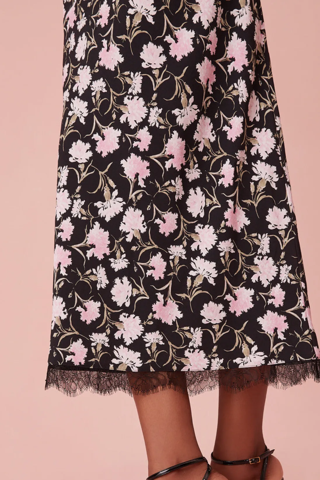 Everyone’s favorite Castle Skirt returns for the season in a drapey, soft crepe fabric featuring a sweet tossed floral print all over. This LoveShackFancy essential is a bias-cut midi skirt with a pencil slip shape, offering a flattering silhouette. The skirt features a lightly elasticated waist, ensuring a comfortable and slinky feel while still providing ease of wear. Effortless to pull on, the Castle Skirt combines comfort with style. At the sweep, the edge is finished with a beautiful fringe with a frayed edge, creating a unique and eye-catching detail.