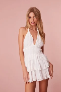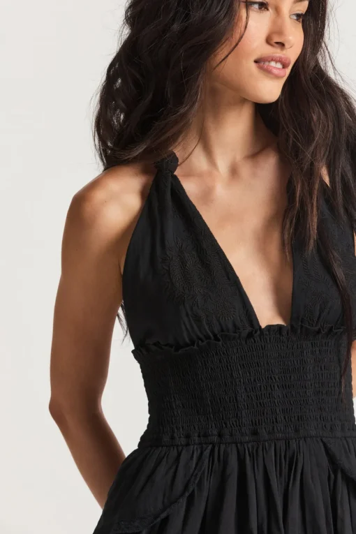 Our favorite Deanna Halter Dress returns for the season. This low-cut convertible halter ties in a generous bow at the neck and be crossed at front. Below a wide smocked waistband, the skirt flares to smaller details at the hips and two ruffled tiers. Pair your mini dress with our heritage Avignon Crop Cardigan.
