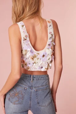 Always dreamy in the Denita Top. Debuting with a cotton ottoman fabric adorned with a sequin-embroidered mesh on top, the pretty top stuns with intricate flower embellishments all over. The scoop neck tank features a vibrant medley of lilac and tangerine payettes with sequins, rhinestones, and crystals sprinkled throughout giving this piece a shimmering and beautiful look.