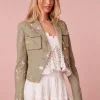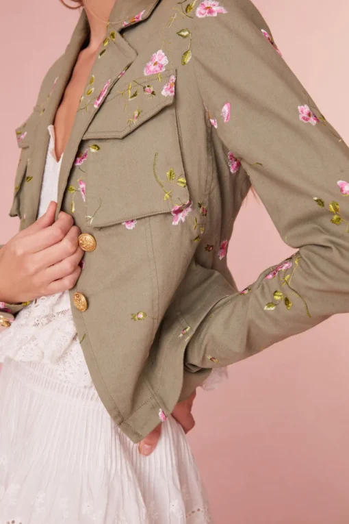 Introducing the Dolisa Jacket. Meet the LoveShackFancy take on a classic military jacket. Designed from a stretch twill fabric, this layer is expertly tailored for a structured yet feminine fit and features pink floral embroideries all over. The jacket has military-inspired pockets on the front and custom gold military buttons at the center. This piece has an elegant 40s-inspired waist with a slight peplum and princess seams that give it a beautiful shape.