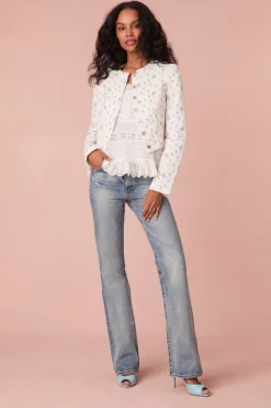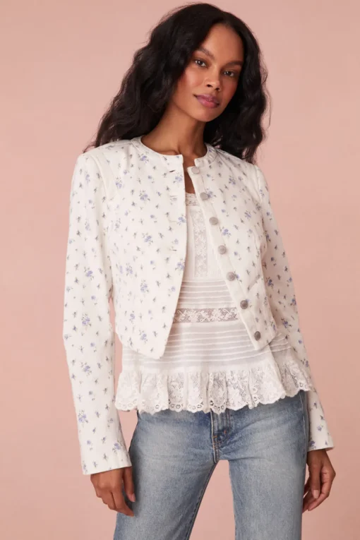 Introducing the Falima Jacket. A must-have of the season, this cropped, white denim jacket features our pocono ikat floral print inspired by a ditsy floral sourced from vintage ribbons in London. With a cool and edgy silhouette, the playful jacket includes a cut-out detail on the front and our custom logo buttons. Pair with your favorite mini skirt for a full look.