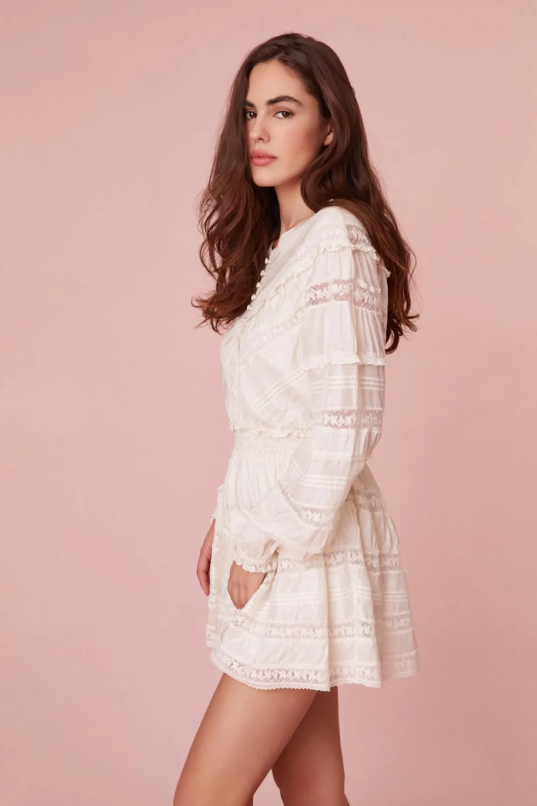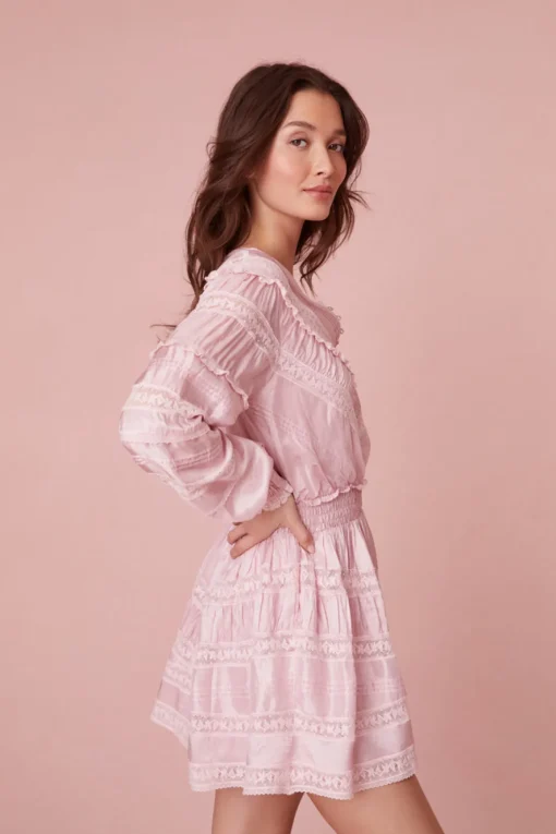 Introducing the Jones Dress – a modern take on Victorian elegance. Crafted from a lightweight viscose habotai, it features Victorian-inspired laces, pintucking, and shirring for sophistication. The dress offers comfort with a smocked elastic waist, dropped shoulders, and a stylish V-neck. A slit with delicate details, loop and button closures, and textured elements add an sweet touch. Elevate your style with this harmonious blend of timeless and contemporary design.