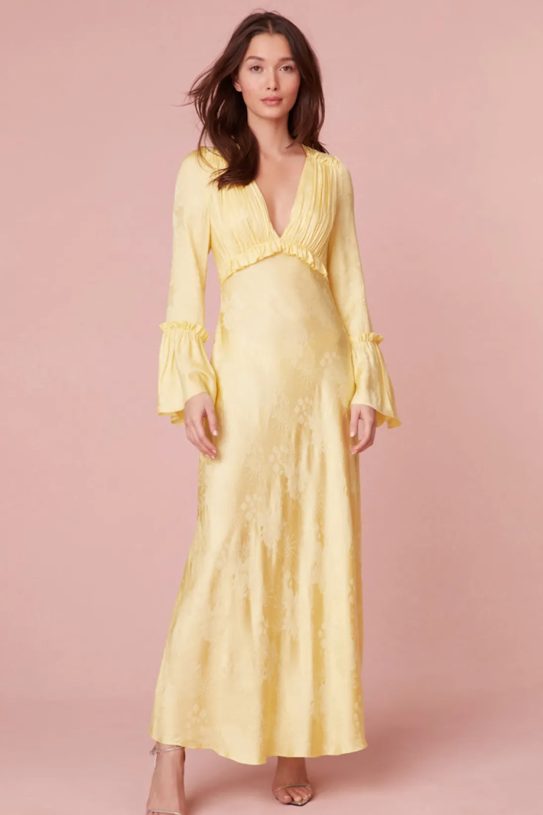 Romance reimagined in the Kalona Dress – a stunning creation in custom silk jacquard featuring a subtle large-scale floral pattern. This feminine jacquard is both slinky and drapey, offering a luxurious feel. The long maxi dress is bias-cut, allowing the skirt to fall gracefully. The deep V-neck is complemented by a shaped waist seam that adds a feminine and flattering touch, hiking slightly at the front. The front bodice showcases beautiful shirred details for texture, while the bell sleeves feature tiny ruffle details at the waist and cuffs, adding a touch of LoveShackFancy charm. Designed for ease, the Kalona Dress is a pull-on style, eliminating the need for a zipper.
