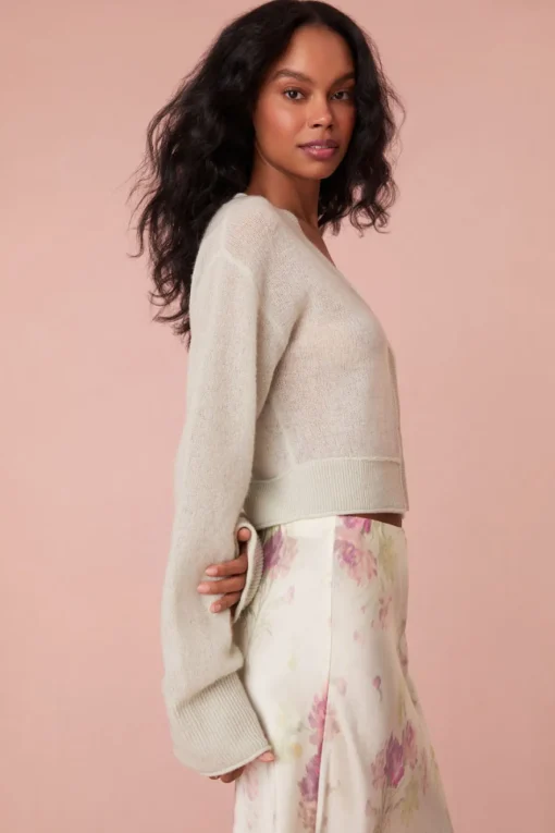 Living in the Lawrence Cardigan. Ultra soft and lightweight, this must-have springtime knit is designed from an off weight cashmere fabric featuring ribbed detailing with loops along the seams. Airy and breezy, the sweet knit is finished with our custom bow buttons down center front and a dreamy bow embroidery on the back.