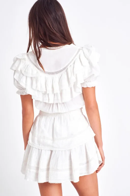 With delicate inset lace trims and thoughtful pintuck details, our vintage-inspired Liv Dress is pure romance. Puff sleeves and a double-tiered yoke top are a nod to Victorian lingerie, and the ruffled miniskirt is ultra-feminine. Front ties finish the scoop neckline, and the cinched elastic waist is flattering and comfortable. Accessorize with our LoveShackFancy x Lova Flower Hoop Earrings.