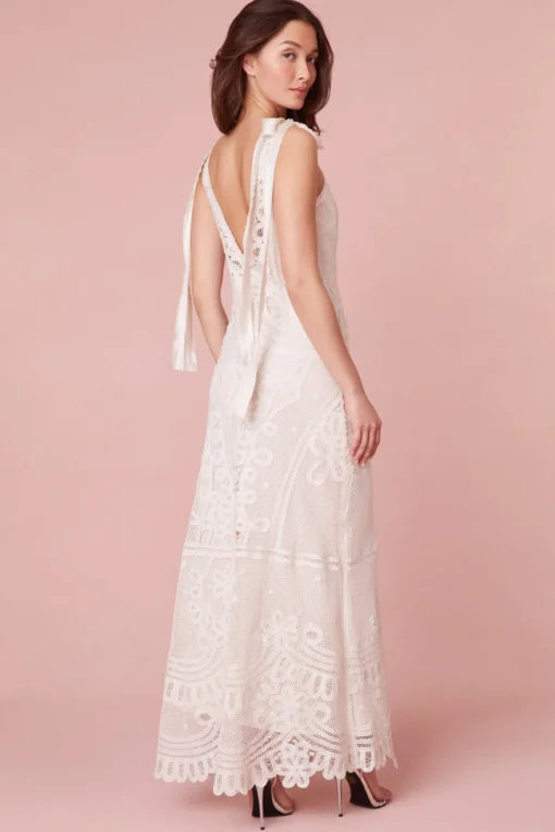 Introducing the Lora Dress – a vintage-inspired battenburg maxi dress that embodies timeless beauty, making it ideal for a beach wedding or any special occasion. This ethereal dress gracefully skims the body, creating a stunning silhouette. The Dress features a beautiful arrangement of battenburg flowers and netting, adding a delicate and romantic touch. The sexy V-neck complements the overall design, creating an effortlessly elegant look. The dress is fully lined for comfort and includes wide raw-cut charmeuse straps that you can tie yourself, adding a customizable and chic element. A sexy, deep V-back finishes the stunning dress.