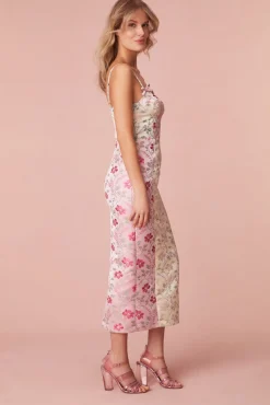 Introducing the Massey Dress. Effortlessly blending sexy with sophistcation, this stunning midi features a custom developed jacquard fabric with beautiful vintage-inspired French dahlia flowers developed with two different springtime shades – a pretty pink and pastel green. The flattering dress mixes two types of prints giving it a dreamy color blocking look. This bustier pencil dress features cup details at the bust and princess seams down the front for a flattering and figure-hugging silhouette.