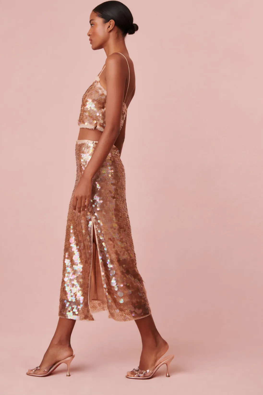 Effortlessly chic in the Miller Skirt. This must-have midi stuns with shimmering sequins all over. This piece has a fixed waist and comes lined. Perfect for every party you have coming up or your next night out.</div
