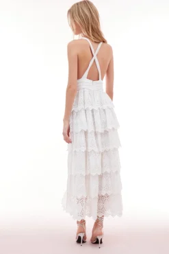 Make an entrance in the Nevis Dress. This statement piece stuns with an airy, cotton voile fabric with eyelet detail all over. All in the detail, the dress begins with a halter neckline outlined with a scallop edge that criss-crosses in the back. A fabric rosette adorns the center front before falling to the epic, multi-tiered skirt. The dress has an elasticated waist for easy wear.