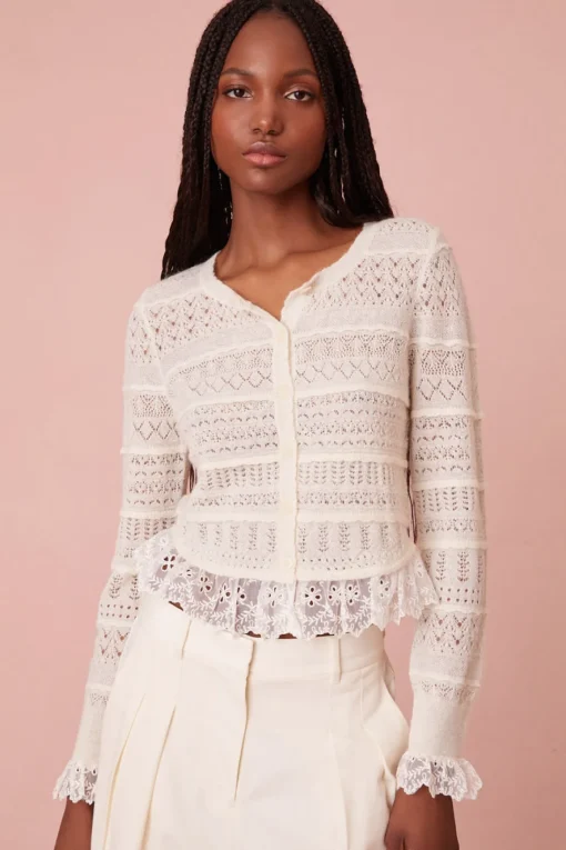 The Norden Cardigan stuns with a lightweight alpaca blended fabric with a variation of intricate pointelle stitches throughout the body. All in the details, this dreamy knit features custom embroidered lace at the hem and the sleeves. The must-have piece is finished with custom bow-shaped buttons down center front.