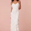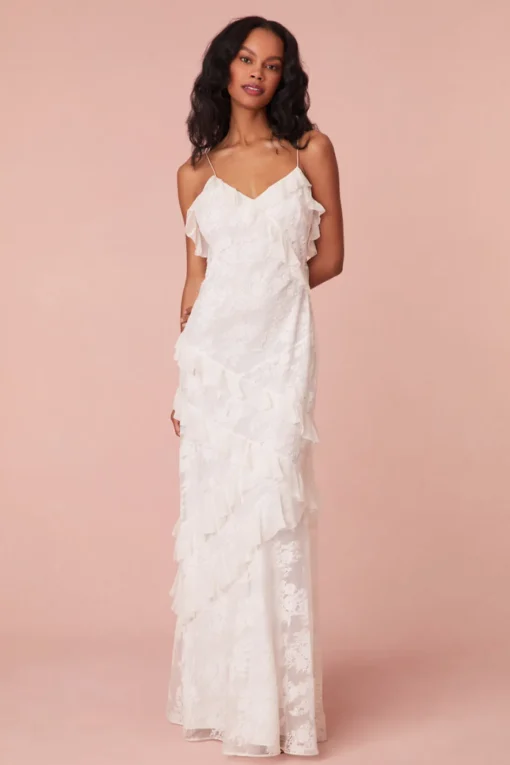 Our best-selling Rialto Dress returns for the season designed with floral applique lace all over giving this fan-favorite a delicate look. This stunning maxi features a subtle amount of sheerness giving it a slightly sexy, but still modest look. The piece features overlapping, asymmetrical ruffles at the neckline that continue to descend through the entire skirt. Slightly fitted, the dress includes a side seam zipper for closure.