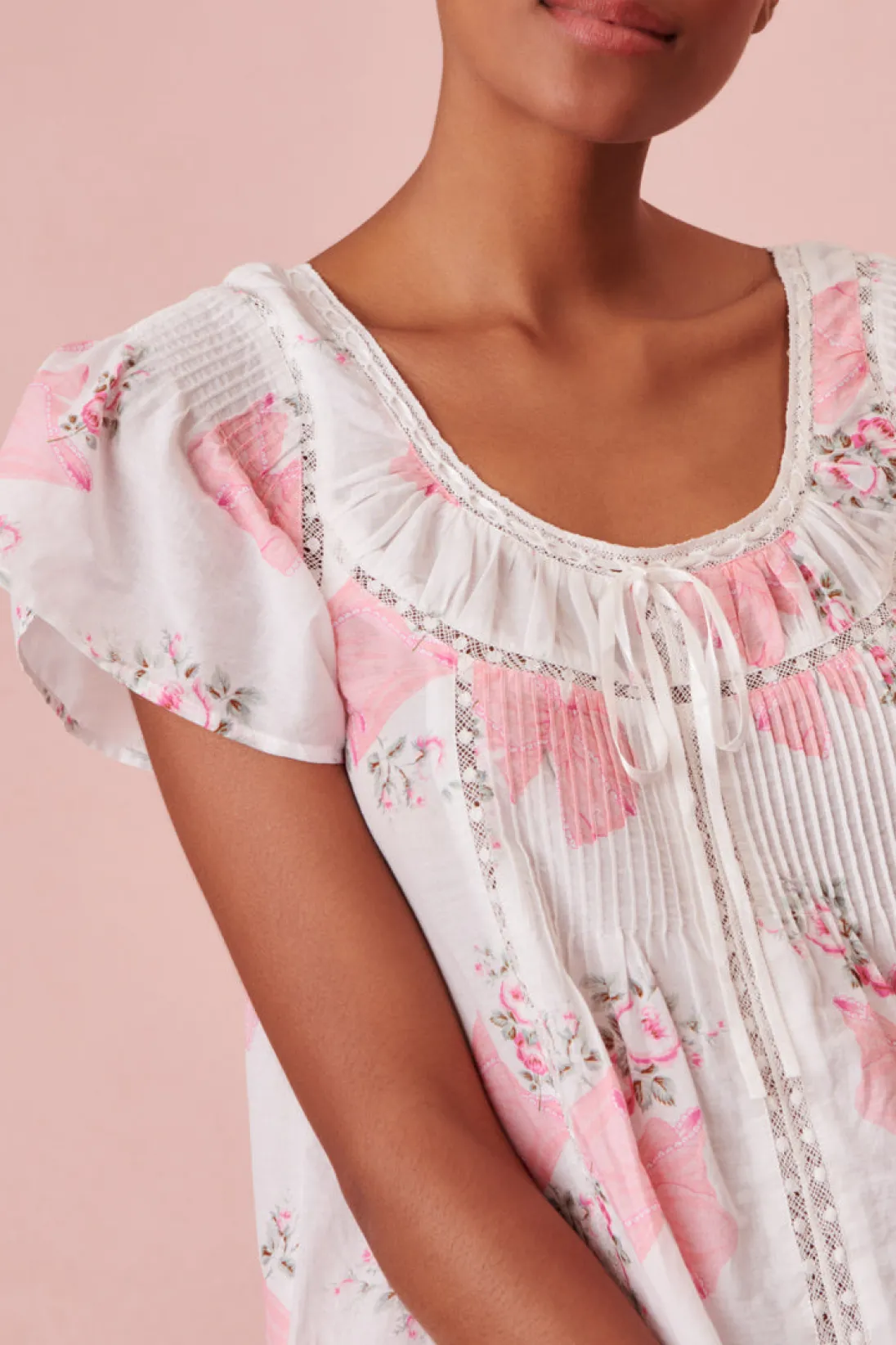 The Sashi Dress swoons with our pretty pink bow print all over. This airy nightgown features short flutter sleeves, custom lace insets, and a sweet ribbon detail at the neck.