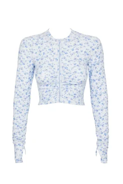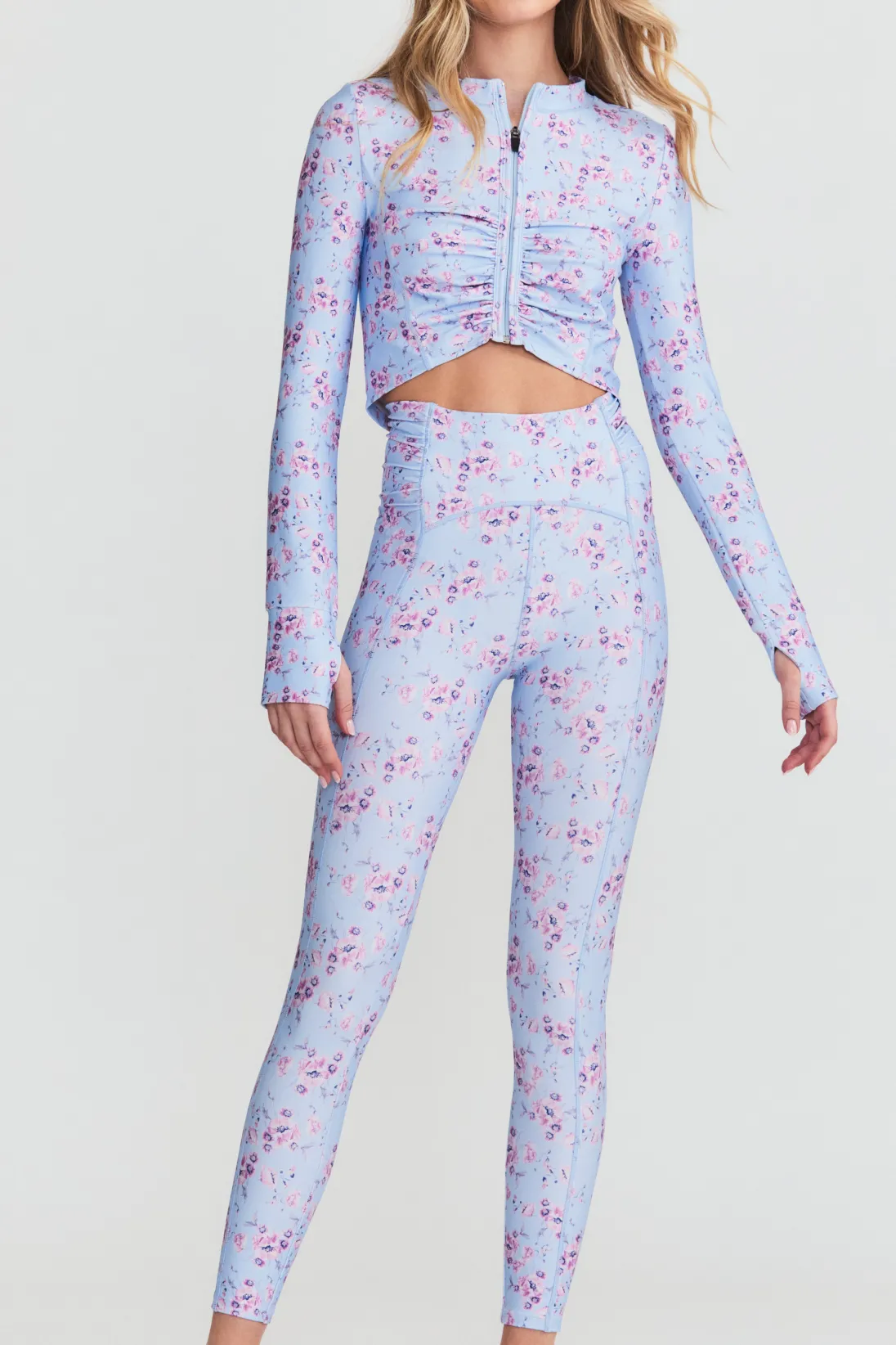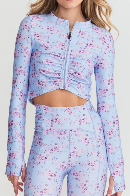 Living in the new Sindra Jacket. Designed for the girls on the go, this active layer is lightweight and ideal for cool days outside. The jacket features our dainty floral print, a ruched center for a flattering fit, a center-front zipper, a slightly cropped hem, and long sleeves.