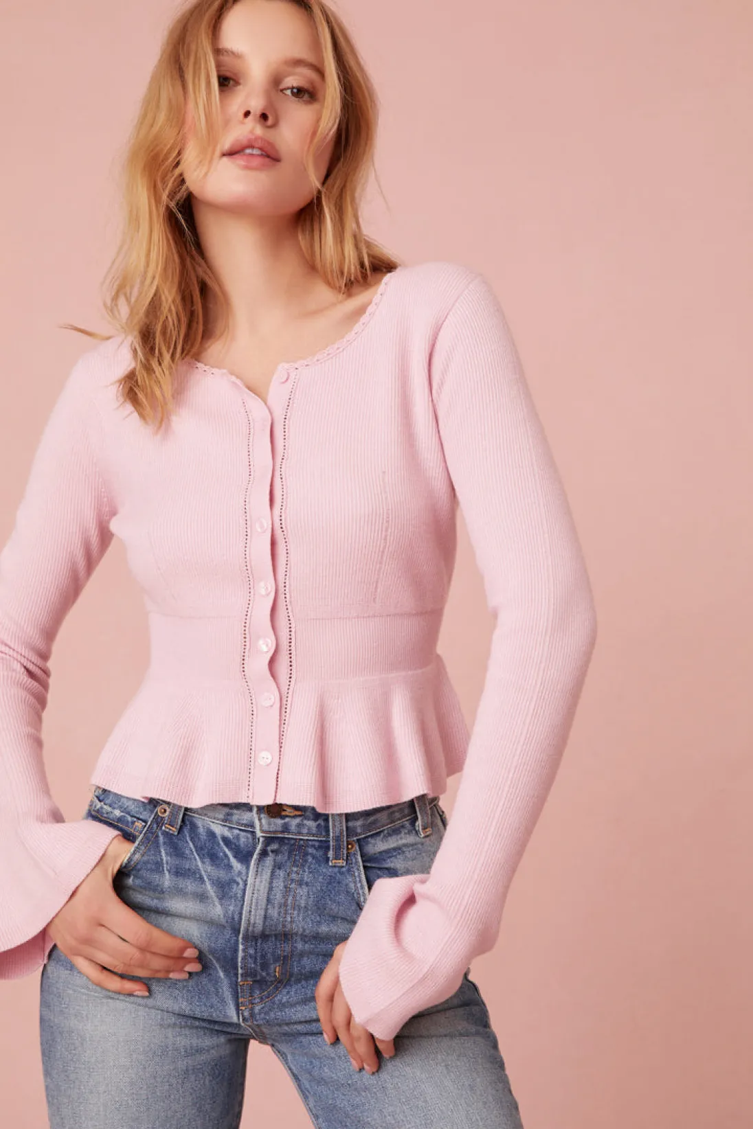 Introducing the Stonington Cardigan. This knit is designed from a lightweight merino wool fabric with a ribbed stitch throughout the body and pretty pointelle details at the princess seams. There’s a bagatelle trim along the placket, sweet trimming along the neck, and cotton lace along the neckline. This cardigan is finished with long bell sleeves and a peplum hem for a sweet finish.</div