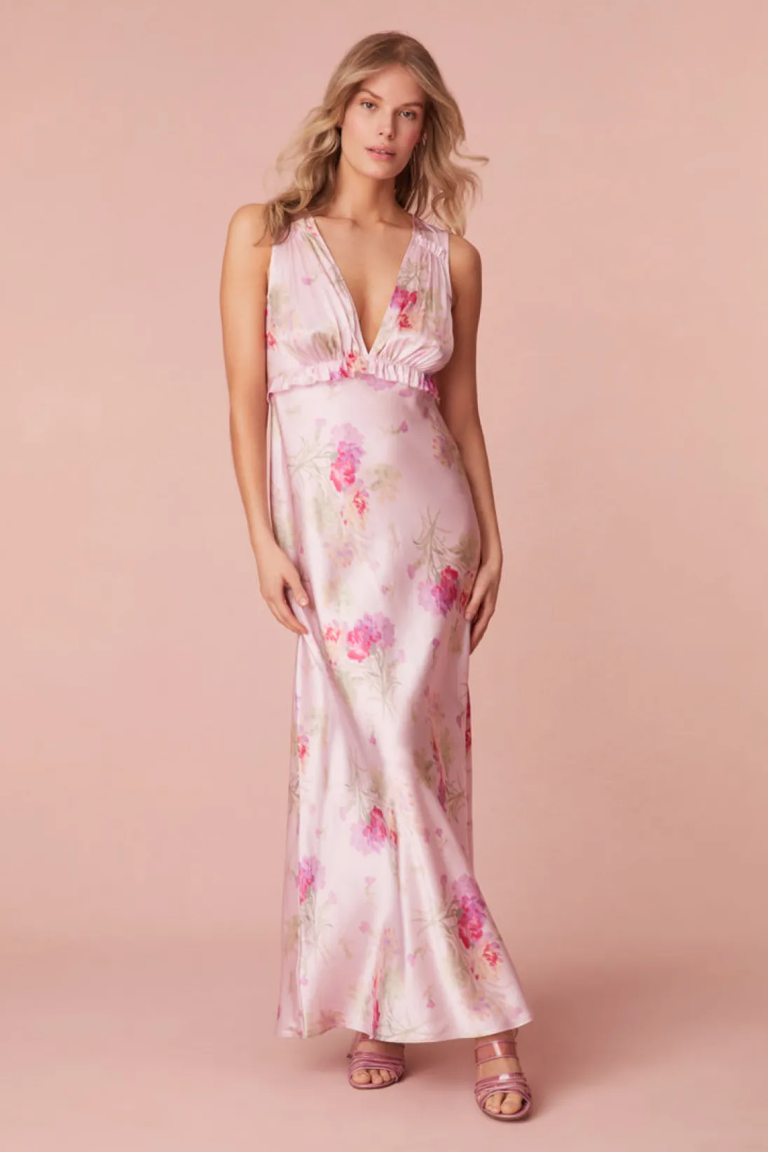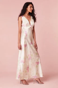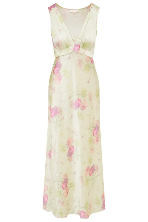 Subtly sexy in our Suniva Dress. This dreamy maxi is designed from a soft, silk charmeuse fabric with our new pretty in pink bouquet print all over. With a drapey silhouette, the stunning dress features a v-neckline, a ruched bodice for a flattering fit before falling to a body-skimming, bias cut skirt.</div