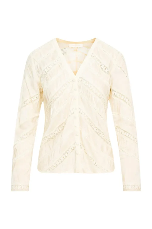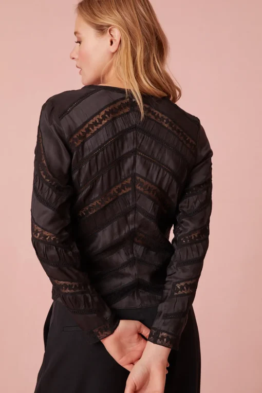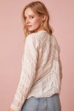 Introducing the Tandra Top. This pretty, Victorian-inspired piece is designed with a luxe, viscose habotai fabric with beautiful, vintage-inspired laces and textural shirring details all over. A new iteration on our best-selling Jacques Top, the Tandra features a v-neckline and diagonal laces for added texture detailing. Effortlessly sexy, the top pairs well with your favorite mini or vintage jeans.</div