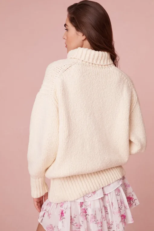 Introducing the Valli Pullover – a cozy and luxurious addition to your wardrobe featuring intricate Peruvian cables. This chunky tunic-style pullover boasts a comfortable and oversized fit, perfect for a relaxed and chic look. Crafted from soft Peruvian cotton, the fabric has a delightful textured feel, adding a touch of uniqueness. The rib trim, found on the sleeve cuffs, bottom hem, and collar, is a chunky and dimensional detail that enhances the overall design. Perfect for a laid-back yet sophisticated look. As seen on model, pair with our Ruffle Mini Floral Pink Skirt for a flirty look.