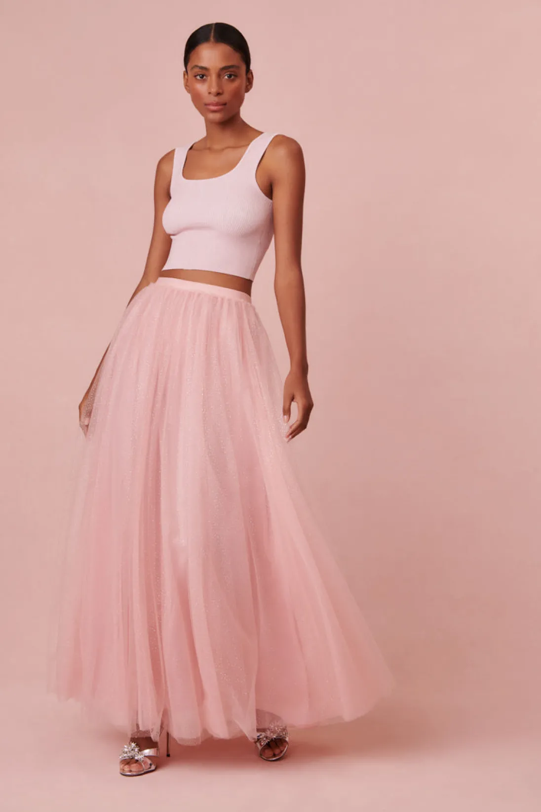 A dream comes to life with the Wilona Skirt. The stunning evening skirt is inspired by the 80’s with a soft tulle that’s structural and lovely to wear. Perfect for your next holiday party, the pink pall skirt features silk glitter all over for a shimmer effect and has a satin waistband at the elastic waist for an easy, pretty pull-on.