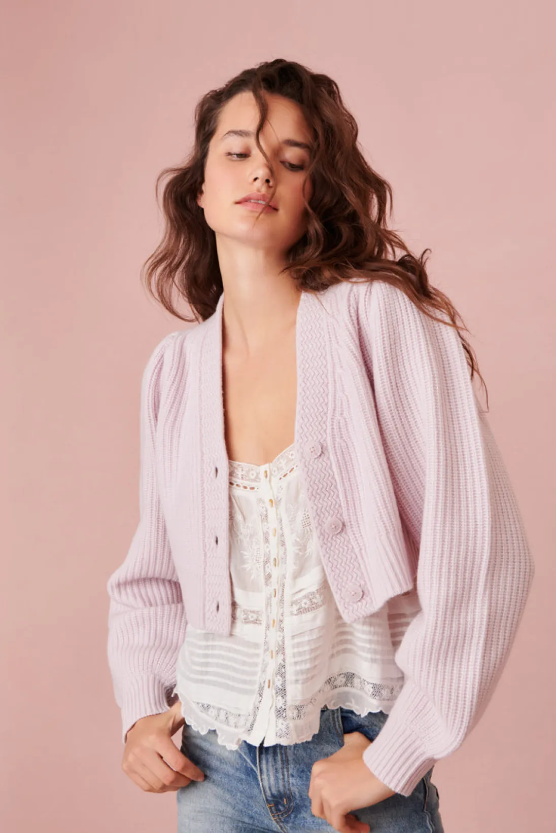 A signature favorite, our Avignon Cardigan is back in a cashmere-wool blend with intricate knit techniques. This cropped sweater, at once cozy and cute, has a v-neck that descends to three buttons at center front. Pleated blouson sleeves extend to ribbed cuffs at opening. </div