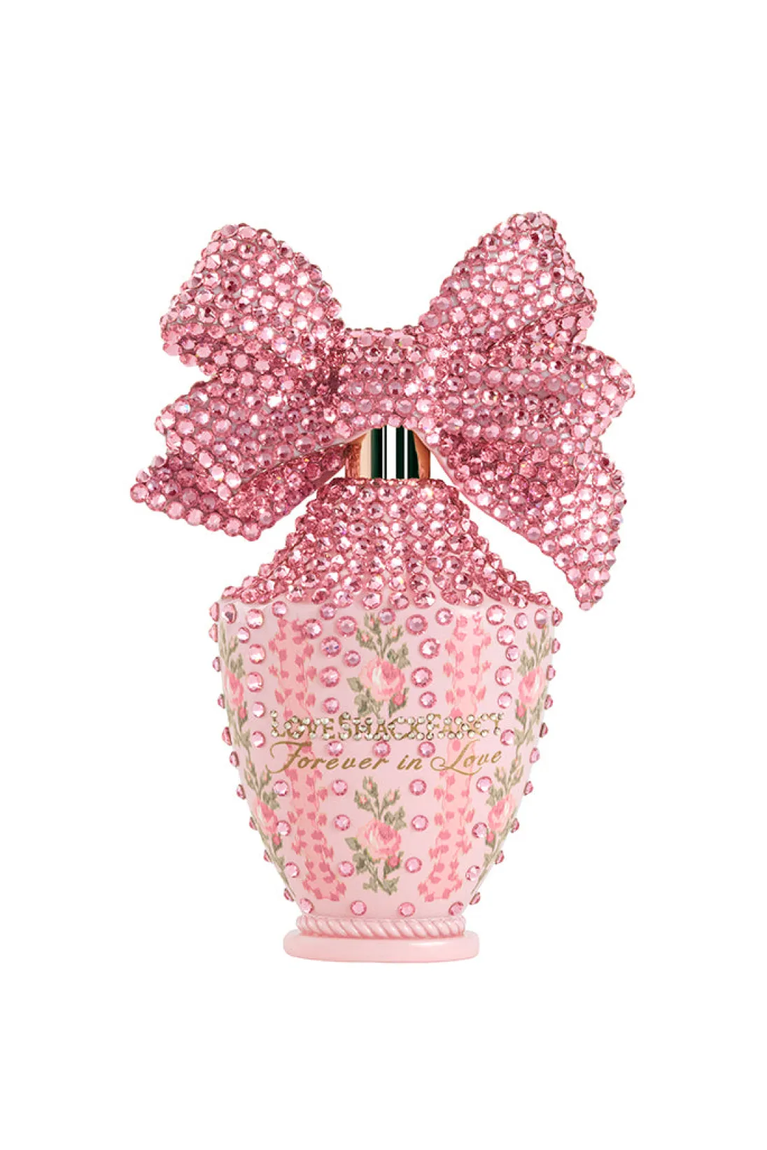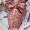 An oversized bow, perfectly imperfect. The LoveShackFancy perfume bottle references founder Rebecca Hessel Cohen’s lifelong love of bows and ribbons with a sculptural bow top that appears tied and tightened by hand. The hot pink and green Blooming Heirloom print is a signature design chosen from over 2,000 in the LoveShackFancy print and lace library to decorate the blush pink-colored bottle, a softly curved antique-inspired vessel carved with scalloping on top and a ring of rope on the bottom. Once finished, its spray top is removable so the bottle can be upcycled as a bud vase.