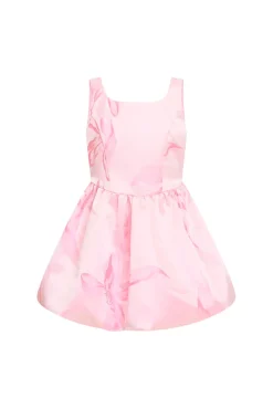 Our girls are pretty in pink in this gorgeous must-have dress. With our custom LoveShackFancy bow jacquard taffeta fabric, this dress is ready to make magic moments. She begins with tank top straps and a fitted top before falling to a sweet, bubble-like skirt.