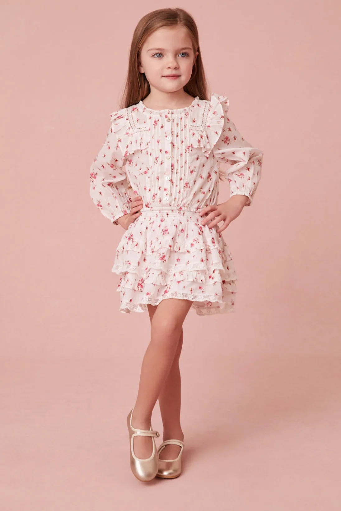 Our Oda Top returns for our little loves in 100% cotton in our hero print of the season; a sweet, dainty floral. This easy, transitional blouse features intricate custom lace detail at the round neckline and throughout the ruffle-adorned bib, airy long sleeves and small embroidery detail all over.</div