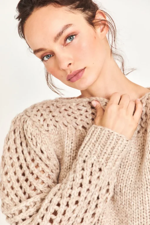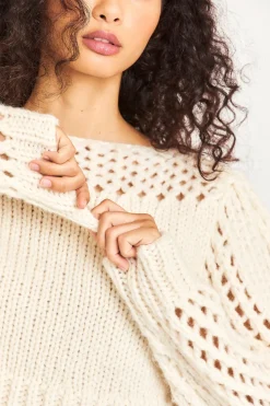 Love layers with our Larson Crop Pullover. This ultra-soft sweater is delicately hand-knit from a Peruvian alpaca blend into a stunning, semi-sheer, clip dot fabric. With a silky and luxurious feel, this must-have top features gorgeous pointelle sleeves and pointelle detailing underneath the boat neckline. The top slightly crops at the hem for a playful finish. </div