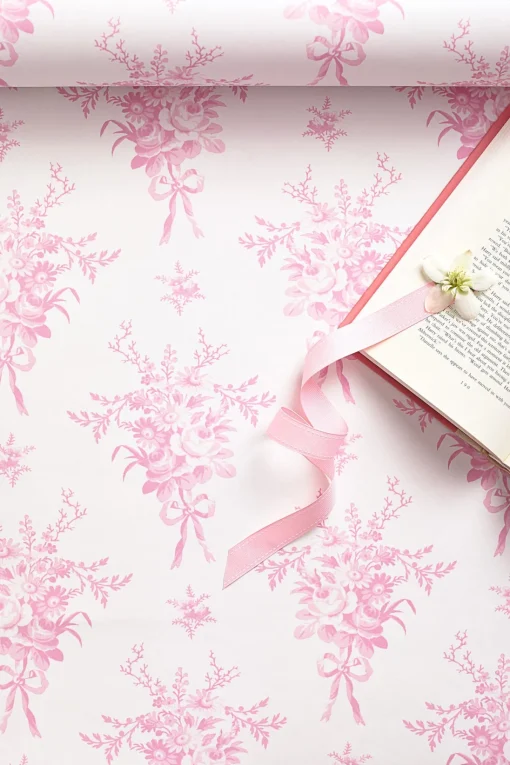 Romantic elegance is found. Charming, vintage floral accents in painted shades of pink and antique white feature bouquets of lush roses and assorted wildflowers. Shown here in Sunrise Kiss Pink.