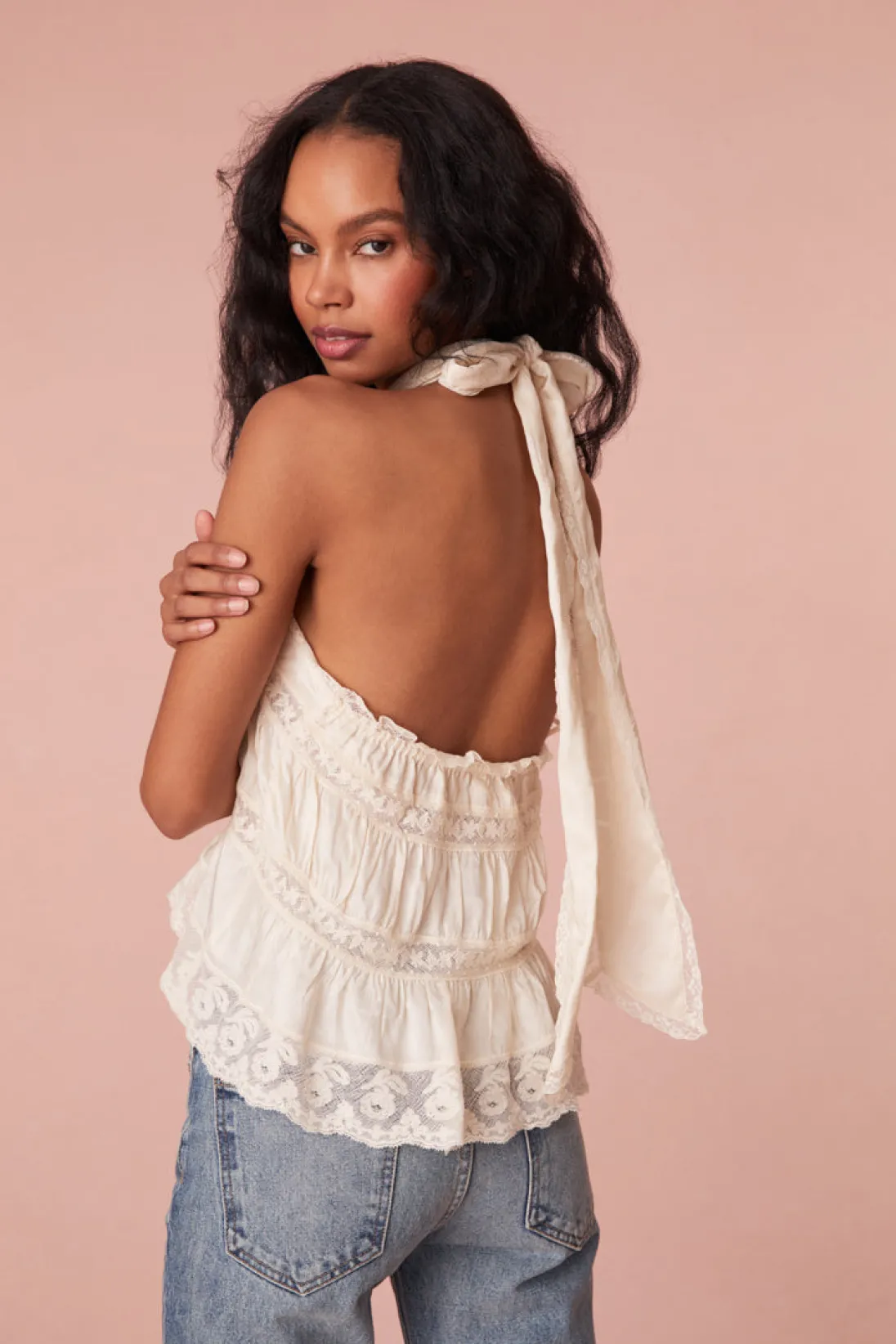Introducing the Alessandro Top. This Victorian-inspired piece is designed with a luxe, viscose habotai fabric with beautiful, vintage-inspired laces and textural shirring details all over. The delicate and breezy halter top ties with a knot at the back, the top of bodice has elastic for easy and comfortable wear and then falls into a playful trapeze shape with laces woven throughout.