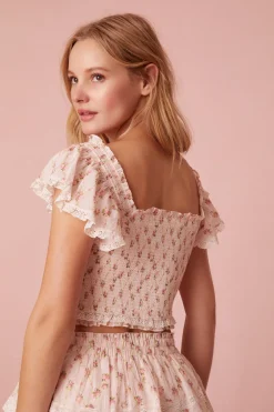 Forever sweet in the Beaming Top. This pretty top stuns with a dainty floral printed cotton voile fabric. Slightly cropped, the top features short puff sleeves with lace trimming, a sweetheart neckline, and a smocked bodice. Pair with the Ruffle Mini Dainty Floral Cotton Skirt for a full look.</div