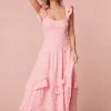 Step into sunshine with the Brin Dress. Designed from a springtime cotton dobby striped fabric, with a subtle stripe texture, the midi features beautiful small top-applied ruffle details in a zigzag formation. This must-have dress features a smocked bodice throughout that releases at the high hip into a sweepy, dramatic skirt making it a dreamy, sophisticated party dress. The piece begins with sweet flutter sleeves with tiny ruffle trims, top-applied ruffle details at the bodice in a chevron design, and intricate top-applied ruffle details at the skirt.
