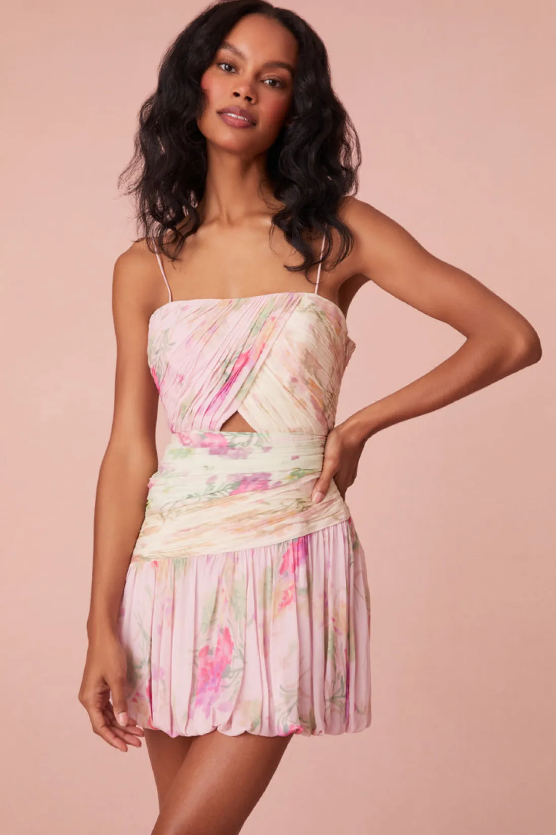 Springtime chic in the Camonete Dress. The pretty mini arrives with a printed viscose rayon chiffon fabric featuring our large scale dreamy floral print mix in pink, cream, and a light green colorway. The ruched dress begins with tiny spaghetti straps, a structured bodice with a flirty keyhole detail at center front that descends to a flirty, 80s-inspired bubble skirt with a playful asymmetrical hem with ruching details for a sweet finish.