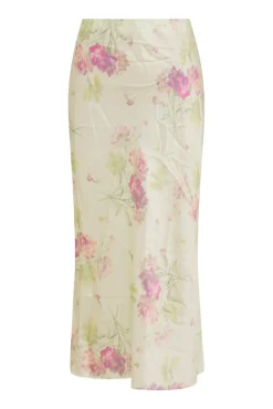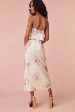 Everyone’s favorite Castle Skirt returns for the season in a drapey, soft crepe fabric featuring a sweet tossed floral print all over. This LoveShackFancy essential is a bias-cut midi skirt with a pencil slip shape, offering a flattering silhouette. The skirt features a lightly elasticated waist, ensuring a comfortable and slinky feel while still providing ease of wear. Effortless to pull on, the Castle Skirt combines comfort with style. At the sweep, the edge is finished with a beautiful fringe with a frayed edge, creating a unique and eye-catching detail.