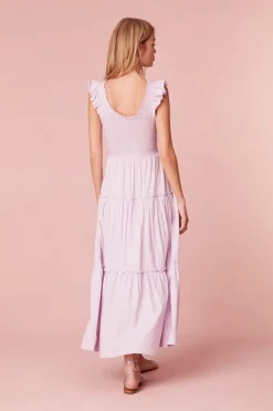 Our best-selling Chessie Dress returns for the season in a new pretty shade. Featured in a playful ultra-soft cotton, this airy dress is perfect for a date night or soaking up sunshine. Ruffle sleeves flutter at the shoulders that merge around the scoop neck. The fitted smocked bodice flounces into a dreamy midi skirt decorated with custom lace insets.