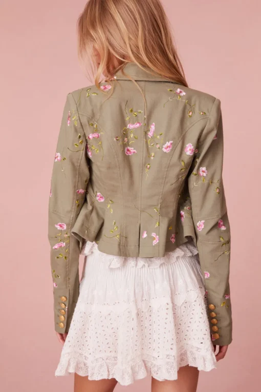Introducing the Dolisa Jacket. Meet the LoveShackFancy take on a classic military jacket. Designed from a stretch twill fabric, this layer is expertly tailored for a structured yet feminine fit and features pink floral embroideries all over. The jacket has military-inspired pockets on the front and custom gold military buttons at the center. This piece has an elegant 40s-inspired waist with a slight peplum and princess seams that give it a beautiful shape.