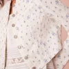 Introducing the Falima Jacket. A must-have of the season, this cropped, white denim jacket features our pocono ikat floral print inspired by a ditsy floral sourced from vintage ribbons in London. With a cool and edgy silhouette, the playful jacket includes a cut-out detail on the front and our custom logo buttons. Pair with your favorite mini skirt for a full look.