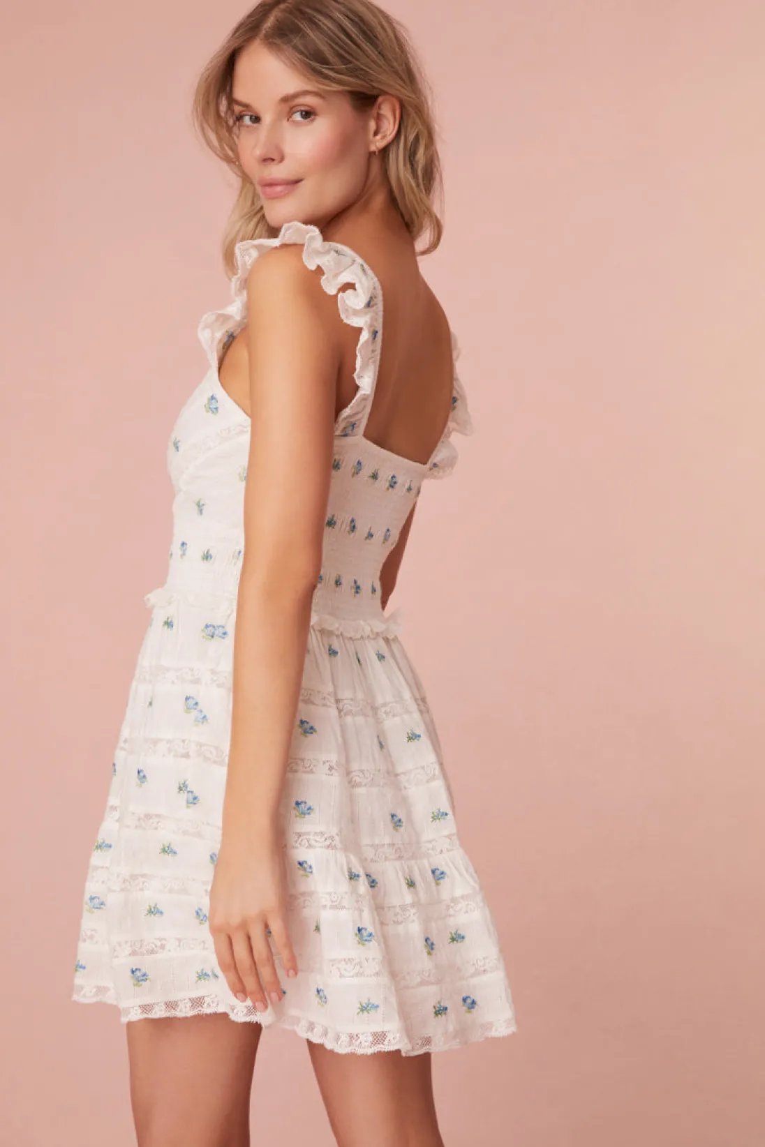 Falling for the Finny Dress. She’s airy, dreamy, and easy to wear. This must-have mini features our pocono ikat floral print inspired by a ditsy floral sourced from vintage ribbons in London. The dress begins with an open v-neck with elasticated flutter sleeves before falling to a smocked waist for comfort and a flattering fit. The bodice and skirt feature a sweet medley of lace and embroidery arrangements throughout. This piece is complete with pockets.