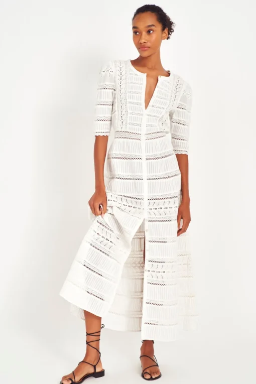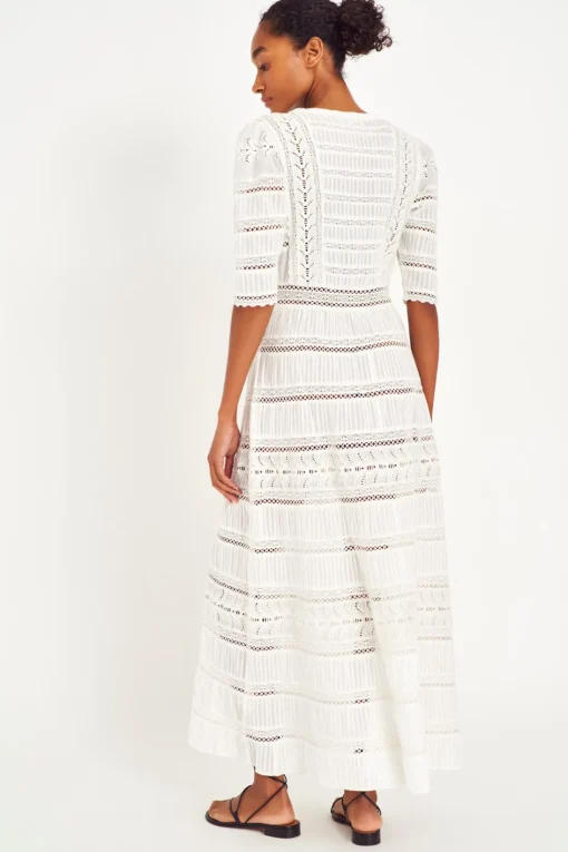 Our Flora dress is a forever favorite in Balearic lace. This dress is intricate and elegant with mother of pearl buttons down the length of the body. The sleeve is slightly shirred at the shoulder and finished with a darling ruffle at the elbow-length hem. The maxi length skirt features alternating strips of pin-tucked cotton, schiffli embroidered eyelet, and custom inset lace trims. The inset lace waistband is flat at the front with elastic at the back for ease of wear. Accessorize your Flora Dress with our LoveShackFancy X Lova Flower Hoop Earrings.