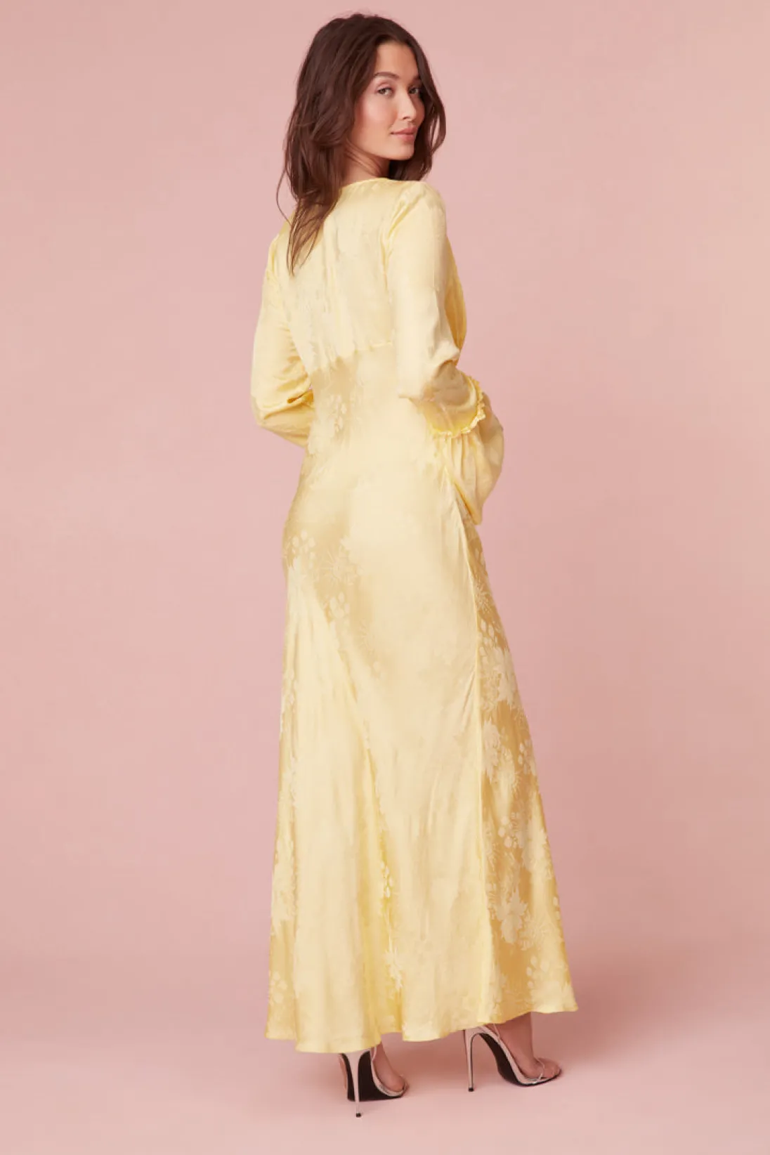 Romance reimagined in the Kalona Dress – a stunning creation in custom silk jacquard featuring a subtle large-scale floral pattern. This feminine jacquard is both slinky and drapey, offering a luxurious feel. The long maxi dress is bias-cut, allowing the skirt to fall gracefully. The deep V-neck is complemented by a shaped waist seam that adds a feminine and flattering touch, hiking slightly at the front. The front bodice showcases beautiful shirred details for texture, while the bell sleeves feature tiny ruffle details at the waist and cuffs, adding a touch of LoveShackFancy charm. Designed for ease, the Kalona Dress is a pull-on style, eliminating the need for a zipper.