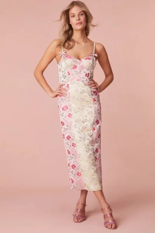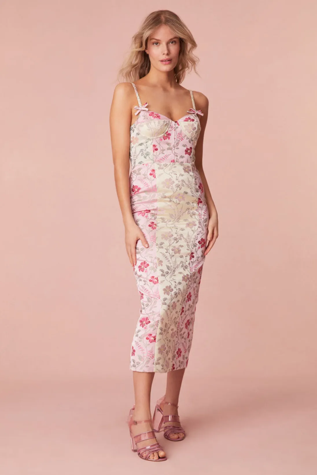 Introducing the Massey Dress. Effortlessly blending sexy with sophistcation, this stunning midi features a custom developed jacquard fabric with beautiful vintage-inspired French dahlia flowers developed with two different springtime shades – a pretty pink and pastel green. The flattering dress mixes two types of prints giving it a dreamy color blocking look. This bustier pencil dress features cup details at the bust and princess seams down the front for a flattering and figure-hugging silhouette.